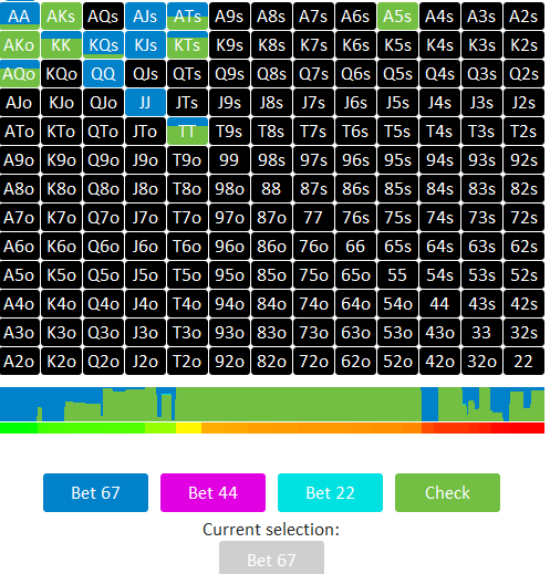 Вбил в солвер раздачу, он со своей стороны полностью одобрил мою линию, вроде и сыграл правильно, а все равно какой то осадочек остался. Этот постоянный вопрос, а будут ли реги нл5 агрессивно разыгрывать блефы ?
