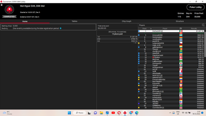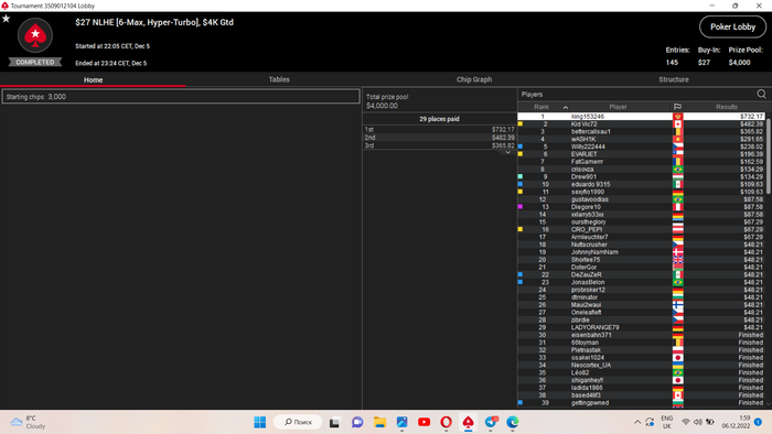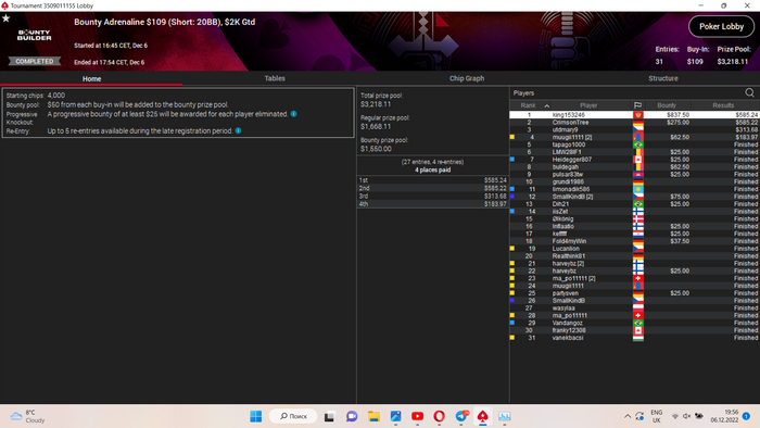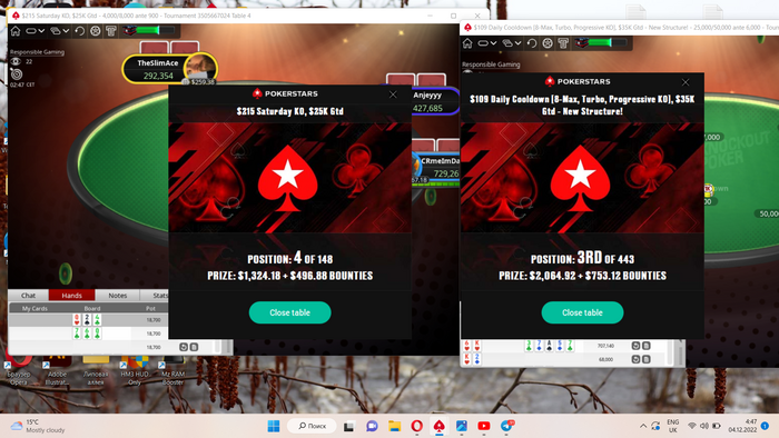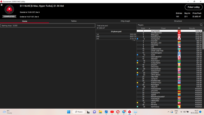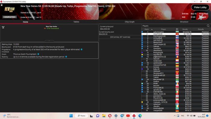 Врываюсь в новогоднюю серию. Большую часть пропустил, ибо сначала забронировал на новый год домик в сербских горах, а потом понял что в Сербии нет старзов. А затем умудрился схлопотать сотряс, когда уезжали и убирая багаж в автобус, забыл что сверху железяка. Но такой турнир не мог пропустить даже с сотрясом, хотя и пришлось показывать ближе к Б-игре чем к А. Были шансы на топ-1, по сути все решил флип с АД против 66 за 80% фишек в игре. К сожалению, в серийниках нет такой глубины в финальных раундах как обычных хедзапов (100-200 бб), и основные деньги приходится разыгрывать в глубине 30-40 бб.