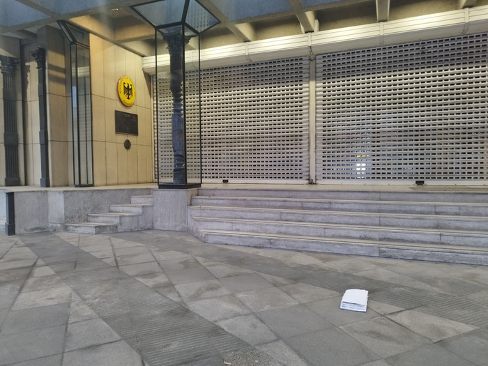 Забавный способ оставить почту перед кажется немецким посольством. Натолкнувшись на закрытые двери и не обнаружив почтового ящика, почтальон не придумал ничего лучше чем оставить корреспонденцию просто на земле)
