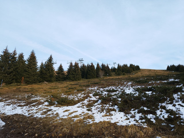 Те дни что мы там отдыхали было аномально тепло и днем было +10. Соответственно, снег почти везде потаял.
