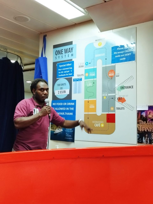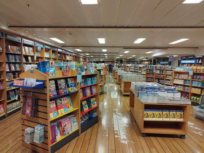 Большая часть литературы была с религиозным уклоном(библии вообще можно было взять бесплатно), так как корабль несет христианство в массы(для Европы это не так актуально, как там для Африки, где все дети, побывавшие на корабле, уйдут с этими библиями). Ну мы с женой взяли, я - пару кулинарных книг, она - книгу по живописи. Это битва за наши души проиграна.