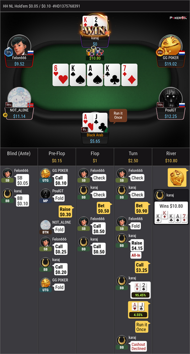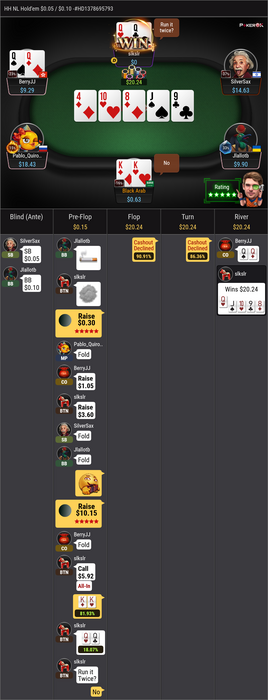 я провожу сложные математические расчеты и понимаю что этих денег мне даже на булочку в буфете не хватит а если я выигрую я могу купить еще чашку кофе ,тем более что это ставкой мы вибиваем руки фармата 43s+ J7s+ Q2s+ K2s+ с мелкими и средними карманками у нас монетка K и Q я блокирую, АА там практически нет,для плюсового пуша у меня достаточно хорошие шансы на победу