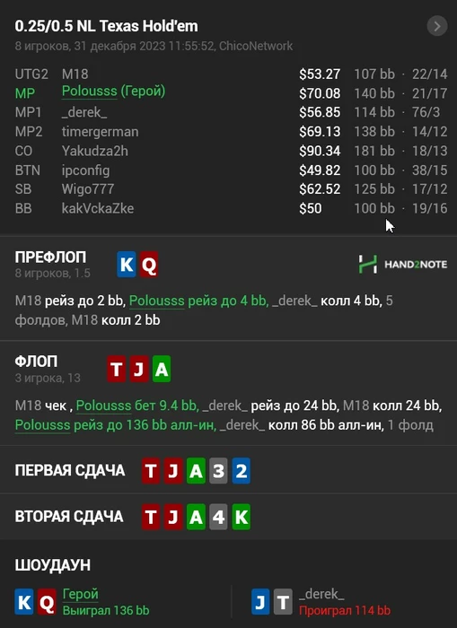 2. Не сохранилась в х2н. На терне выставились втроем, у меня стрит, у второго спортсмена натсовый сет, у третьего 2 пары. И о Бинго, я устоял