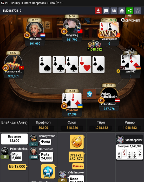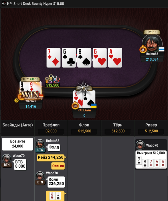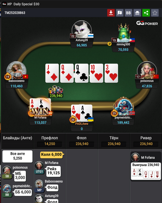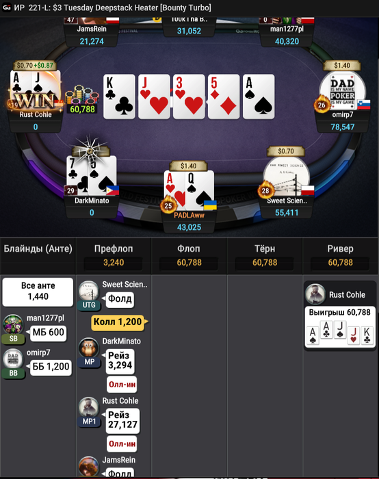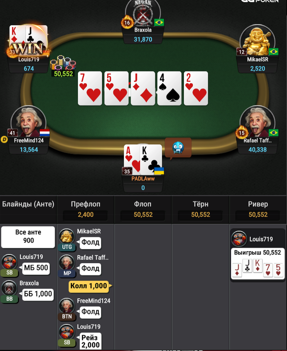 Считается если там было 74 чел? хах. Ну вообще стол мог камбэкнуть весь вчерашний фак-ап. Но увы. Финальная раздача. Если честно думал мая будет😁!. Лоу пары в шортдеке, та даже JJ/QQ - это часто🤮