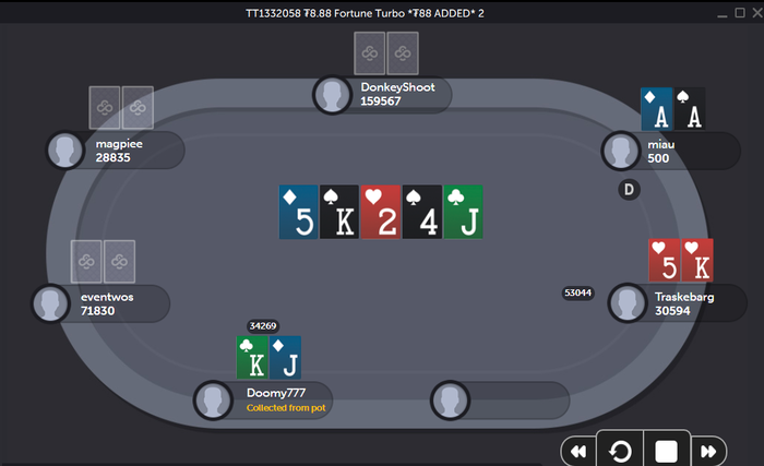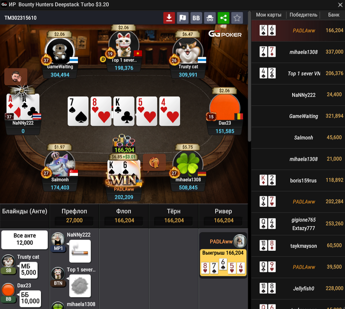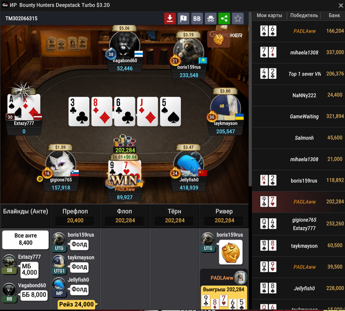 Утрешня прям файн была. А вот вечером меня трахнули. В начале прям чуть не заныл. Три стола отлетели за 20 минут (один из них был с утроенным стеком). Четвертый стол уже потел, выставлялся по минимуму, старался умом. В итогу Топ 1 забрал.
