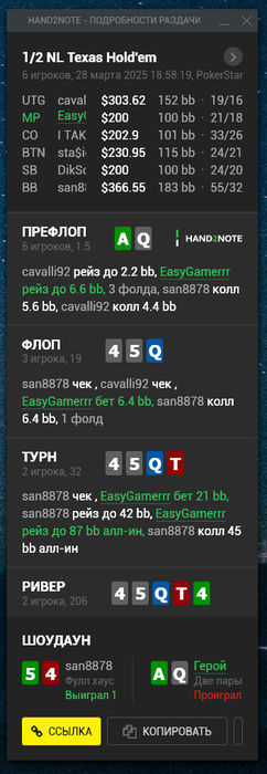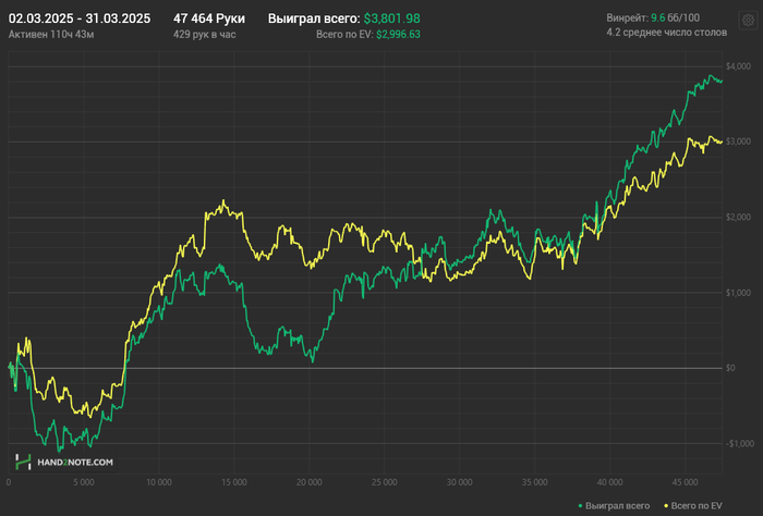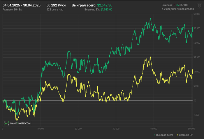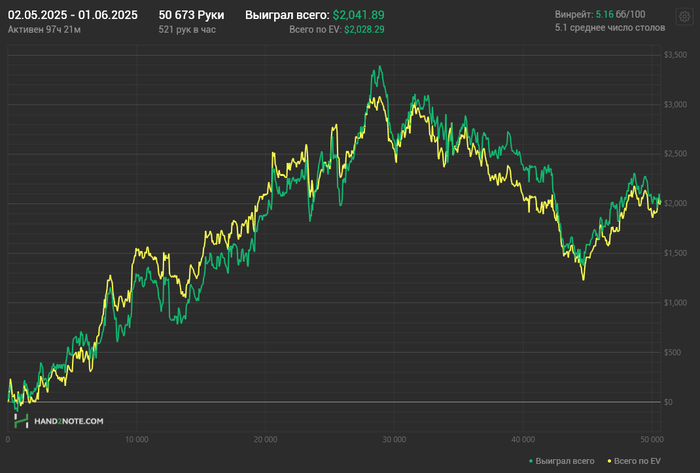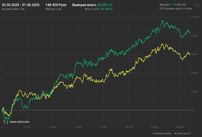 График за 3 месяца. Каждый месяц примерно по 100 часов наиграно. На линию ЕВ УЖЕ можно внимание на обращать. Х2Н начал очень по уебски ее считать на редстаре. Некоторые руки со страховкой оппов тупо потеряны и не записаны в базу, а там были раздачи где я проигрывал на 200ке 90+% эквити. Плюс считает коряво, даже если вписало. Вот вам пример: