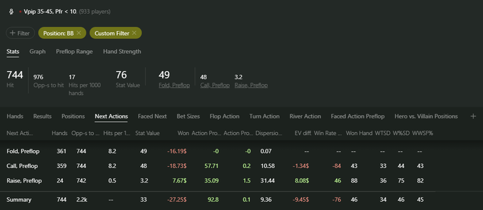 Ты столько времени убил на это, но я не понимаю зачем? Ты взял какой то диапазон, но не изменил диапазон на разные сайзы, хотя сам же привел 2бб и 3бб. И + ты что будешь под каждого опа считать? И вдруг, внезапно каким то чудом рейк куда то делся. Т.е. банк от 4х до 6бб - норм, который мы ещё иногда будем разгонять. А стартовый банк в 2бб, где мы дай бог разгоним до 5-6бб - не норм. Таам же рейк пиздец. А стратегия то какая сложная. КБет лупи под 100%, и ЕВ печатай.