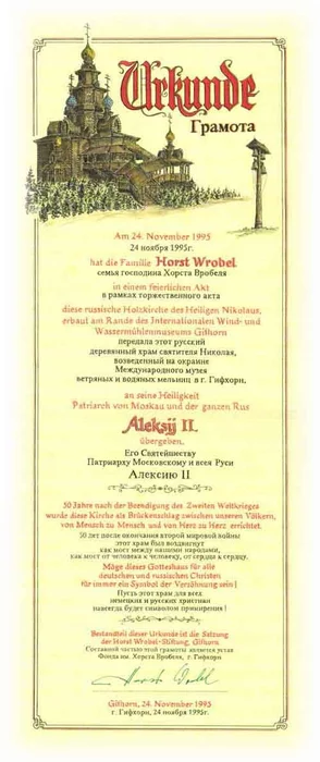 В 1974 году он и его семья основали Международный музей мельниц в деревне Зулендорф ( район Ильцен ) на пустоши. Когда музейная собственность в Зулендорфе не дала Вробелю желаемых возможностей расширения, в 1980 году они открыли Международный музей мельниц в Гифхорне. В Германии Вробеля называют «Дон Кихотом наоборот» — «всю свою жизнь он сражался не с мельницами, а за них». Ещё многие говорят, что он был истинным фанатиком дерева и конструкций из дерева. После посещения музея русского деревянного зодчества города Суздаль в 1992 году Вробель решил построить копию представленной там Церкви Преображения Господня. Там-то и увидел Хорст Вробель захватывающую дух красоту и узорную легкость православной святыни. По старинным чертежам выстроил у себя в усадьбе копию того самого храма и посвятил его Николаю Чудотворцу. Осенью 1995 года Святейший Патриарх Московский и всея Руси Алексий II, будучи с визитом в Германии, посетил и музей мельниц Хорста, и храм на его территории. В торжественной обстановке семья Вробель подарила Святейшему патриарху Алексию II церковь Святителя Николая. Год спустя (1996) храм был освящён митрополитом Смоленским и Калининградским Кириллом (ныне Святейший Патриарх Московский и всея Руси). Первая служба состоялась тогда же.