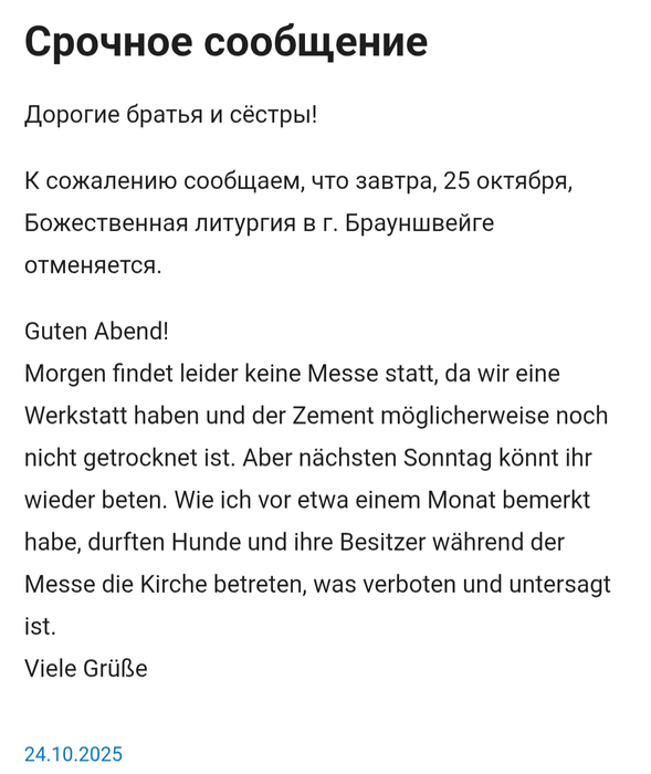 Сегодня утром я проснулся, почти не выспавшись. Всё время тревожился, думая о том, как мне вести себя в церкви и как смотреть в глаза отцу Геннадию после моей неискренней исповеди. Тем не менее, собрался и поехал в Сирийский Православный Храм Брауншвайга. На улице резко похолодало, а вчера свирепствовал сильный штормовой ветер. Людей почти не было и всё вокруг напоминало сцену из фильма о зомби-апокалипсисе. Приехав на место, я пошёл через дворик к большим металлическим дверям, которые были заперты. Сначало не сообразил почему закрыто, но потом вспомнил, что в расписании возможны изменения - этот храм же всё-таки других прихожан, а мы как уже повезет. Посмотрел на сайте и действительно, сегодня служба отменилась по причине ремонта и что цемент ещё не застыл.