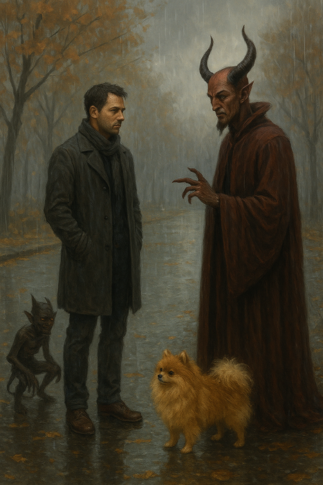 Мой внутренний Бес, узнав эту новость, с радостью вылез из забитого угла и прокричал на все горло, как-будто он поставил на 13 чёрное 100 евро и ставка сыграла: "Ура, хоть тут повезло. Отдохну от этих общественных молитв!". Я направился к машине, чтобы ехать домой, как вдруг откуда не возьмись появилась собака - Шпиц померанский, такой же как у нашей управляющей казино Катерины. Я ещё подумал, что может она тоже в церковь пришла после вчерашней вечеринки в стиле "007", мало ли? Потом вдруг резко появился Мефистофель и я хотел аж вскрикнуть от страха, но стоял как парализован, да и людей не было вообще никого рядом. Обступили меня эти трое, как добычу, и начался снова разговор.