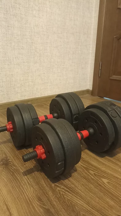 Каждое утро я начинаю с тренировки с гантелями. Рабочий вес 12 кг.