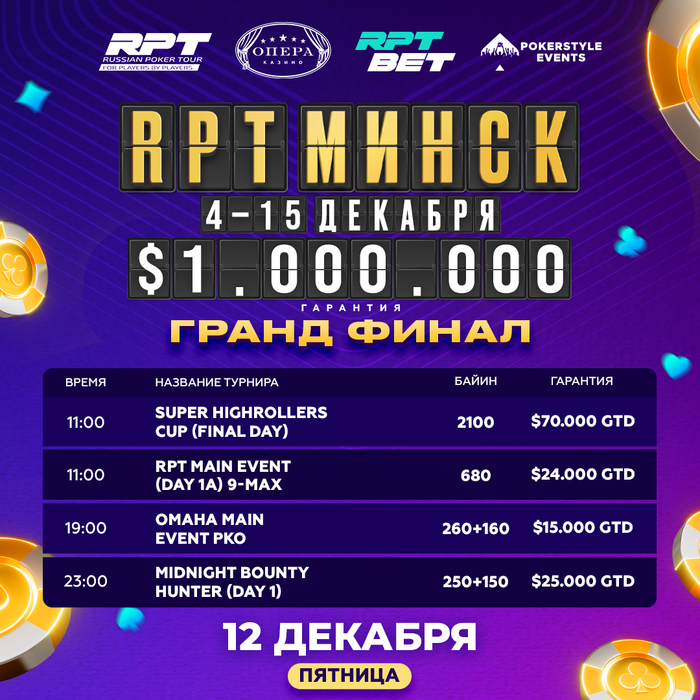 🏆 RPT MAIN EVENT — кульминация всего Гранд Финала и самое ожидаемое событие серии с бай-ином $680 и гарантией $240,000 стартует сегодня в казино Опера!