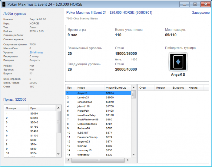 Больше ничего интересного не происходило, аккуратно доиграл уже в призах, без особого успеха.