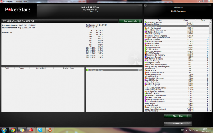 timalexx @ 8.5.2012 Ну вроде отпустило . В топ3 чипак предложил делить, я согласился будучи вторым стеком, но отрыв от третьего был небольшой. А этот долбанный испанец по-английски вообще ничего не понимал. Короче, поделоить было сложно. Стали играть. Я открыл с баттона А9с , агрессивный чипак меня перекрутил, ну мы выставились. У него АJ. GG. Думаю кулер. Против нита еще можно фолд найти, но тут никак. В целом, если не смотреть на призы за первое я доволен. Главное отпустило немного. Теперь могу играть биг за 55