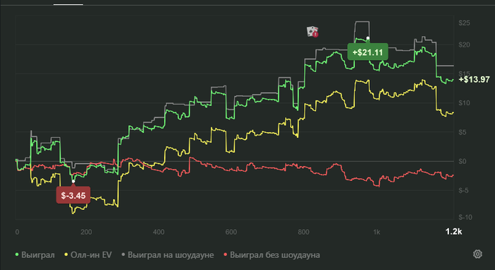 Покатал сегодня дико неудачно. За несколько тысяч рук сильно просел. Везде попал в топ спектра фишей. А с фишками я играю широким спектром. Решил отдохнуть несколько дней от катки. Возможно для спокойствия покатаю лимит ниже. Бр тоже не резиновый.