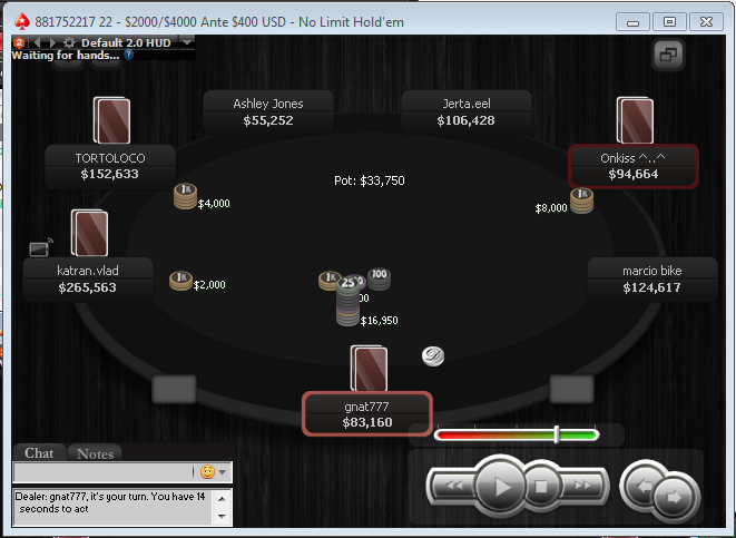 Что- то дипы дипов не идут в посл время. Позовчера в 3- максе АК в АА уперлась, вчера в 3- максе 1010 в ДД, сегодня в 4- максе АДс в АКо. Пора бы и в мою сторону уже!)