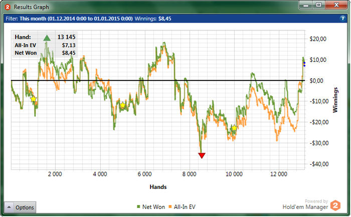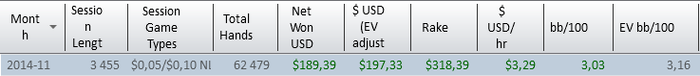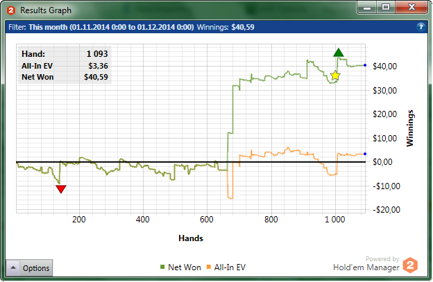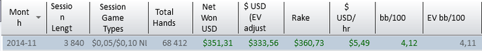 В целом, месяц получился неплохой, с приблизительным профитом в 460$, что для меня очень неплохие деньги (стипендия у меня 50$). Но в тоже время ноябрь и провальный: мало посмотрел водов (4 если быть точным), мало занимался разбором рук, низкий винрейт, часто отсутствие катать и другие неприятные мелочи... Но я уверен, главные покерные победы еще впереди!