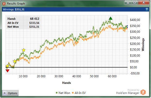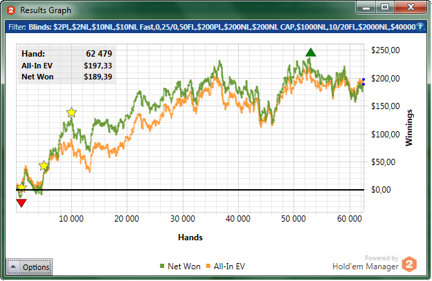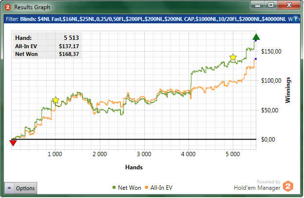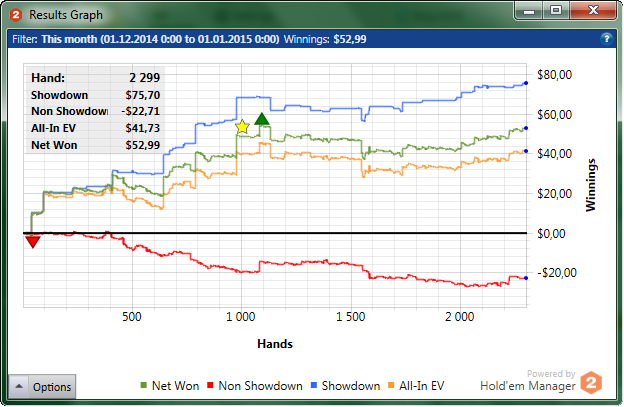 Ноябрь оказался лучшим пока что месяцем по профиту в кеш играх, но в то же время, далеко не лучшим по винрейту... да и количество немного рук не то, которое планировал отыграть. Пробовал свои силы на двух лимитах НЛ10 и НЛ16.. на втором получилось хорошенько апнуть а вот на первом дела очень не очень... Красная просто ужасная, как бы я не пытался ее удержать около нуля, никак у меня это не выходит Стыдно. Поэтому графики без шоудауна