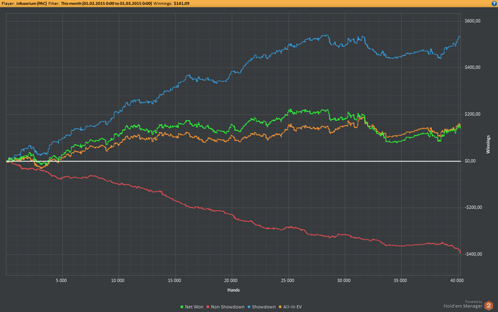 Получилось, что в раздаче ты сделал плюсовое действие на префлопе, минусовое на флопе и минусовое на терне. И затащил.