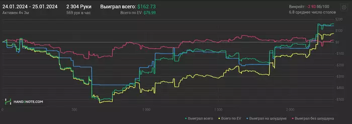 25/01/2024: 4.03ч, 2304 рук nl100 +$148.