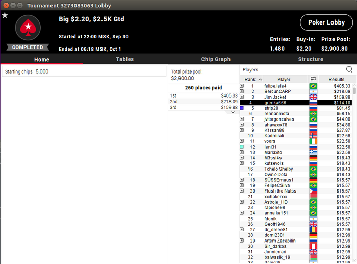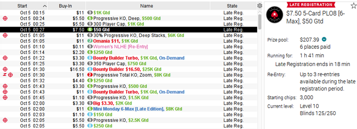 На ПокерСтарз снова бьются гарантии! Так можно было бы озаглавить нижеследующий текст о, должно быть, самом смешном с точки зрения гарантийного фонда турнире на ПокерСтарз: 50$ призовой фонд при турнирном взносе 7.50$, PLO8 5-Card. То есть организаторы рассчитывали на то, что хотя бы 7 участников в этом многостоловом турнире наберется. Неудивительно, что призовой фонд был перебит в целых 4 с половиной раза и составил 225$, чему в немалой степени способствовала долгая поздняя регистрация: зарегистрироваться или зареентриться можно было в течение двух часов, чем воспользовалась одна из британок, совершившая 4 (!) повторных входа, продемонстрировав неумолимую жажду победы при явном сопротивлении фортуны. Забегая вперед скажем, что победить или попасть в призы ей все же не удалось, 30$ американских долларов оказались потрачены в пользу других участников турнира. Максимальный же приз, на который могла бы рассчитывать участница, составил 66.57$. Боже, храни Британию!