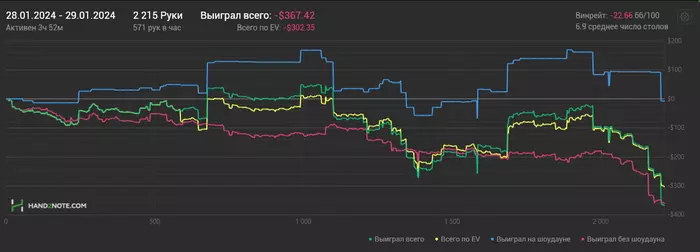 29/01/2024: 3.52ч, 2215 рук nl100 -$383.