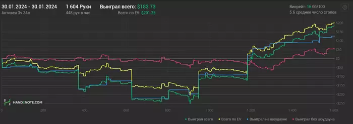 31/01/2024: 3.34ч, 1604 рук nl100 +$174 +$92 bonus, итого: +$266.