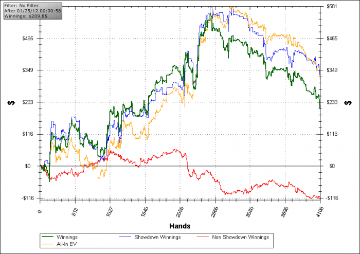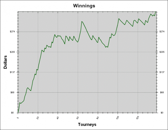 По PTR у меня даунстрик, там и мой прошлый подъем на $1к прошел мимо графика, и этот сейчас не заметен, так что около 50% со мной охотно соглашаются играть. В начале и середине матчей я регулярно проваливался на 5БИ, что лишний раз доказывает минусовость депозитов по $50, чтобы раскрутиться - оптимальная контрстратегия довольно часто становится понятна только на отметке -3БИ. Так что поберегите нервы, если вы не Изильдур, то начинайте с 20БИ, никак не меньше. Ну и на графике видно, что с банкроллом в 5БИ все могло закончиться еще на старте )