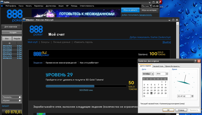 888 @ 10.10.2016 Если я правильно понял ваш вопрос, то — вам нужно открыть вкладку 888poker Club в лобби рума (соответствующая кнопка находится чуть ниже "Кассы") и там во вкладке My Club содержится вся интересующая вас информация, именно в том виде, как вы описали: вознаграждение (количество Gold Tokens) за прохождение уровня, прогресс накопления очков, текущие задания и т.д.