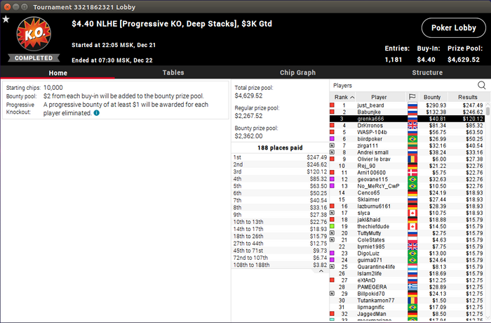 В самом начале финалки мог выбить оппонента, выигравшего турнир, но решил не доставлять полББ с J5o, типа обычно доставишь, выбить не удается, зато опп отъедается. Решил не доставлять, а не сфолдил бы, в той раздаче бы его выбил. В ХА я вышел с огромным преимуществом, что не помешало украинцу разгромить меня за десять минут. И не заходило ничего, и ему заходило, и играть он видимо лучше умеет, вчистую раскатал и алл-ин последний по ФД затащил. Всю финалку пересидел коротышом, может ему заходило очень здорово, что он и финалку коротким пересидел и меня в ХА вынес. Короче, тупо, но факт тьфу. Ирония судьбы.