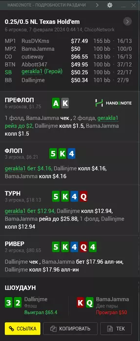 1) Вот пример того, что бетсайзинги решают. Тут ясно было, что у фиша KQ, поэтому изи пас. Конечно, обычно я бы овербетил тёрн, но по чуйке сыграл через простой бет.