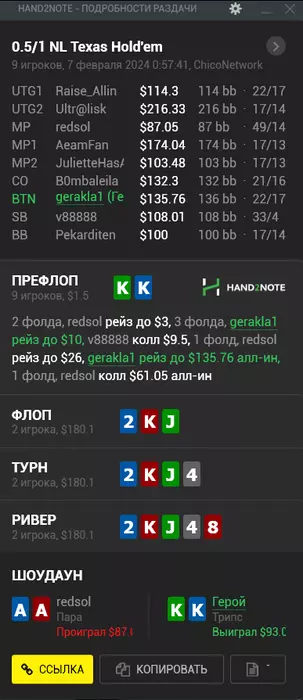 2) Тут тоже чуйка говорила, что у фиша такого типа по этому сайзу и линии тузы, но был чуть в замазке, выкинуть не смог, пришлось переехать. Ну ещё же на этой чике чуть сложнее фолдить КК, потому что это наиболее частый джекпот, АА в КК.