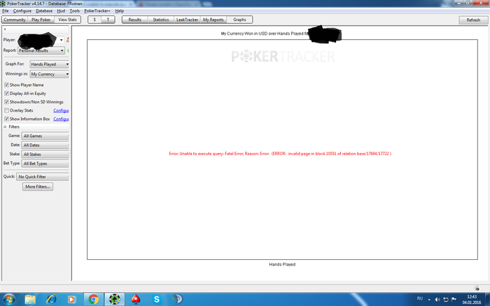 Stas_Bgr @ 4.1.2016 Здравствуйте! Все с прошедшими и наступающими праздниками! Нужна помощь! ПТ4 пользуюсь более 2 лет, вчера во время игровой сессии перестал работать хад на столе. раздачи не сохраняются. Сделал Rebuild Cache, проблема остается прежней. Все запускаю, но статов нет, и в диспетчере задач, в процессах появились не понятный pokertracker web4.exe и pokertracker had4.exe. Было ли у кого то же самое? Спасибо.