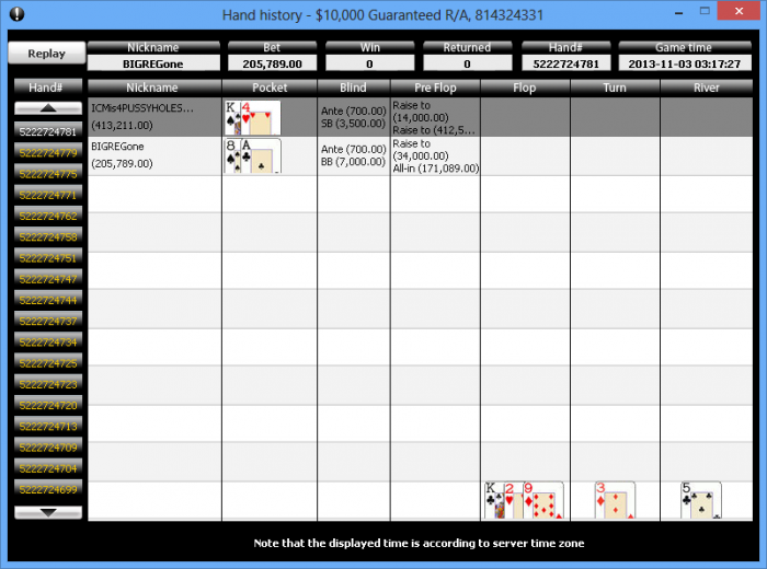 НОЯБРЬ Гипер агрессивный лудоман попался. 420 игр в 0 без стабильности, график обдолбаный,а потом за 80 игр +24к. На этой финалке годмод не закончился. в ХА вышли 100к против его 500к. играли долго. максимум подымал до 285к , но не срослось. он пушил 72s ,К5o в ХА, в 4 максе пушил абсолютно каждую руку,давил по ИСМ. После продолжительного ХА не сумел я выкинуть,хотя мысль была выкинуть и переиграть постфлоп, но бб стали 3.5-7к, в случае фолда 175к против его 425к мне доверия на победу особо не внушали. Конечно ,за оллин стоимостью 777$ (8-9би) можно было и скинуть .