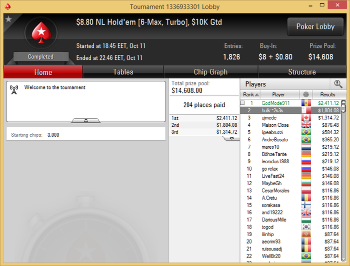 Испытываю жёсткий даунстрик в турнирной зоне,играю фрироллы...за эту неделю имею два баббла на 3К giweaway - 10 место то есть.За один из которых дали на 160 долларов билет в турнир. А ещё сегодня была финалка 1000 depositirs, там 5-ым вылетел короче... Никогда в жизни не было такого с фрироллами.. Вот он турнирный лимит который бью)))