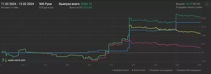 12/02/2024: 1.44ч, 906 рук nl100 +$206.