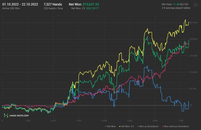 На данный момент обитаю все там же - в приложухах. Есть желание попробовать себя в еврорумах, но до конкретики пока не дошло. На данный момент нижний лимит нл1к. Возможно, это не очень хороший подход, так как хорошей игры на 1к+ не так уж и много. Играю исключительно через старт столов. Поигрываю ХА немного. Пока удачно, но я играю не со всеми. Если расширить сетку лимитов, то думаю можно прилично снизить долю регваров и совсем исключить ХА. Но мне банально лень селектить много лимитов. Моментами не хватает концентрации. Думаю, это до первого серьезного стрика, ибо диспа в регварах огромна.