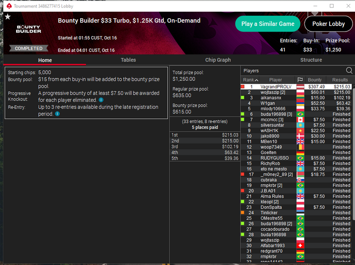 Вчера откатали в 0 и постримили 9 часов. Занесли такой вот небольшой турнир+ было 4-е место в 33-ке и 10-е в 55-ке на optibet! А сегодняшний стрим уже в эфире! Так что всех жду) https://www.twitch.tv/optibetpoker
