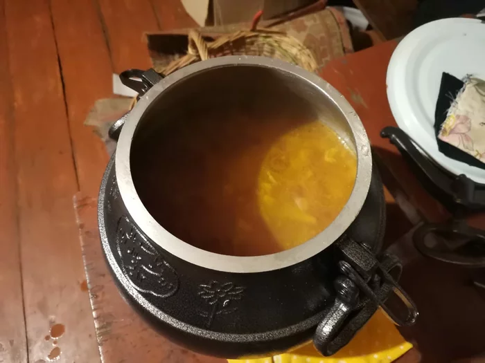 На первое сделал борщ в афганском казане! Обжарил лук, маркву-положил слоями с индейкой, капустой и картохой-4 крупные свеклы! ! Посолила, специи положил и томил это 45 минут!