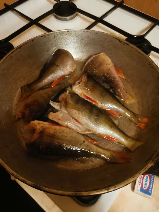 На второе нажарил большую тарерку окуней-свежих, за день до это этого пойианных, замаринованных и ждавших в холодильнике! В этоге даже не попробовали-все сам съел! 😔