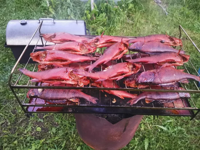 Ровно к восьми вечера закоптил рыбу-очень вышла удачно и по виду и по вкусу! Копченую гости поели😊