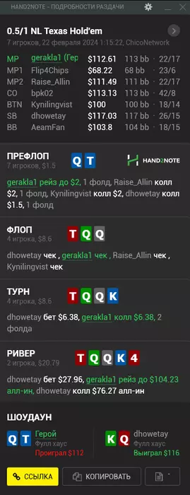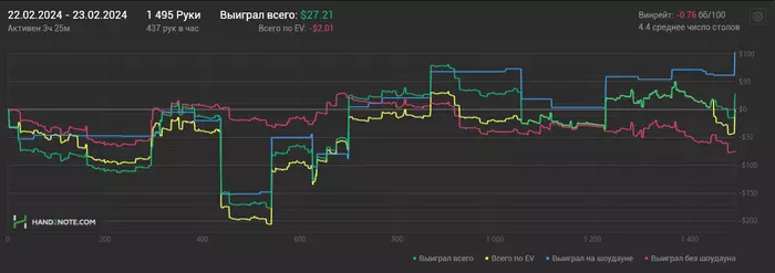23/02/2024: 3.25ч, 1595 рук nl100 +$39.