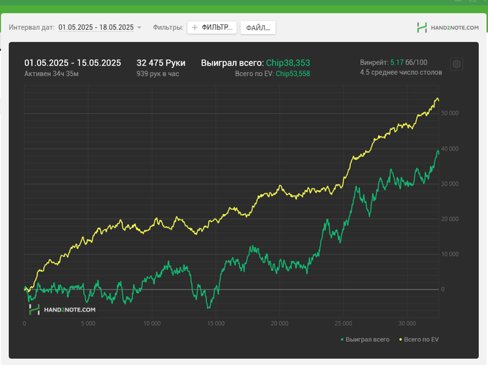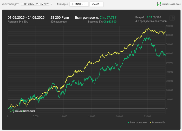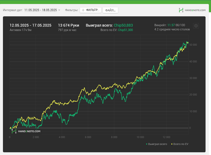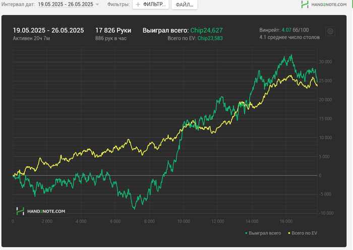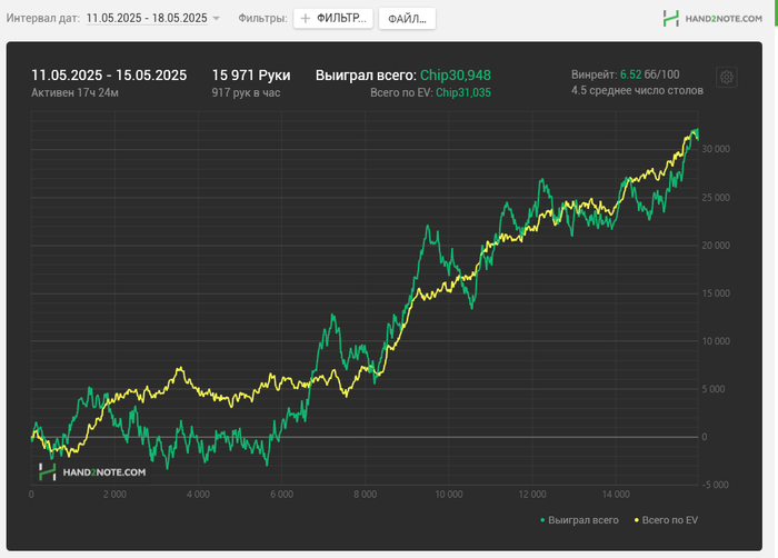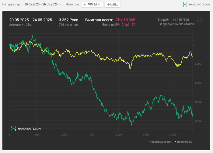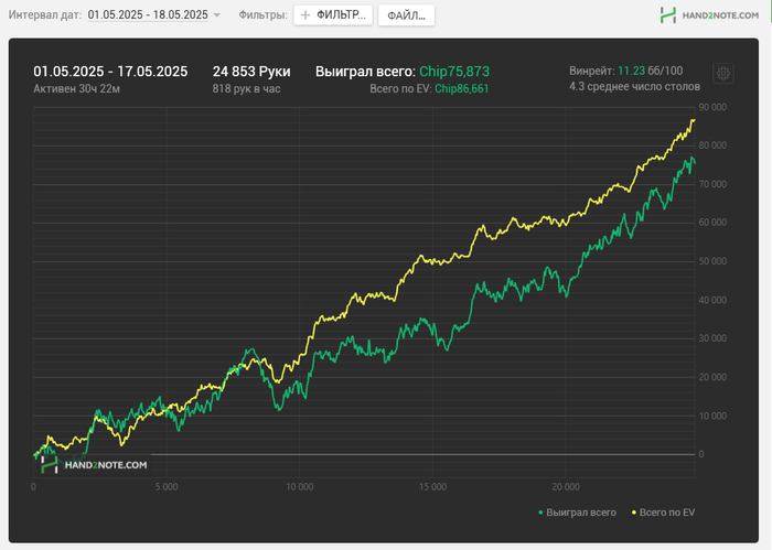Работаем! Сложно все успевать - если честно. Но решил , что пусть идет все как идет и своим чередом. Все стабилизируется возможно когда-то , а если нет, то нет. Загадывать ничего не буду. Знаю лишь то что я получаю удовольствие от игры и от всего что происходит вокруг. На этой неделе хорошо поработал по теории. Записывал короткие видео на 15 мин игры в 6 столов и разбирал их 4 раза так записал. плюс прокликивал все. В этом плане доволен. Если брать количество туриков какие сыграл, то мог бы больше наверное. Но пока не будет стабильности во всем и самое главное хорошего сна, все будет так +-. Ща работаем над этим, скоро все расскажу. Может перейду в более дневное время, но опять же, загадывать не буду. Думаю разорвем) Зря что-ли любим игру и стараемся. )))