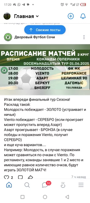 По футболу, у меня травма, шли с запасом, оставалось три игры и две из них с командами идущими на последнем и предпоследнем месте. Проиграли команде , которая на предпоследнем, потом ничья со среднячком в таблице. Сейчас матч с командой идущей на последнем месте но они усилили состав и выиграли команду идущую на втором с которыми у нас дерби было. Надо побеждать и забирать золото, иначе хз че там будет. Ничья тоже даёт золото. Первого июня важная бойня.