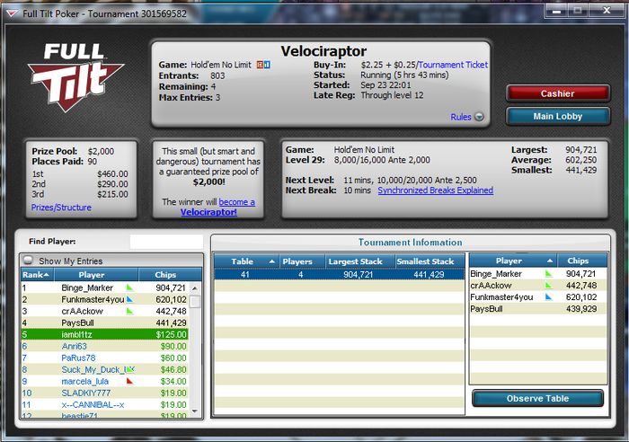 Poker Stars, $2 Buy-in (300/600 blinds, 70 ante) No Limit Hold'em Tournament, 9 Players