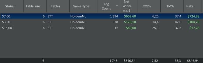 дали опять бонус, накатал в турбины неплохую дистанцию за последние 2 недели. 66% отбил уже, чтобы дали 800$. вообще дисциплина довольна несладкая, много постфлопа, но дисповая из-за турбовости. стрики бывают по 30-50 баинов. Есть своя динамика с регами, которых много. первое время играл очень агро, широко трибетил и стилил, потом когда у регов набрались статы, сузился, потом добавил лимпы со свободных поз и много бареллей и т.д помимо нескольких русских и бразилов, самым опасным показался челик из перу, он катает так же много и очень качественно. по шаркскопу выиграл около 1000 баинов с начала года. сначала я думал, что он круто подстраивается под меня, а потом, полазив по базе понял, что глобально статы против поля и против меня у него слабо отличаются. хотя было много небанальных раздач. да и в целом он меня переигрывает, ну или переигрывал, пока непонятно. Вот как раз с ним был разговор о дележке. Но потом я решил, что лучше буду сражаться, заодно прокачаюсь. в целом укрепил игру перед спф Сочи, куда я очень хочу поехать.