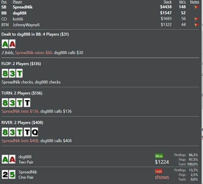 в продолжение рассказа о моих любимах опах выложу по одной раздаче с каждым из сегодняшней катки. 1) против спредника хитро играю, потому что он мистер бот