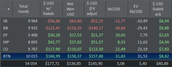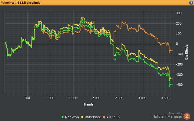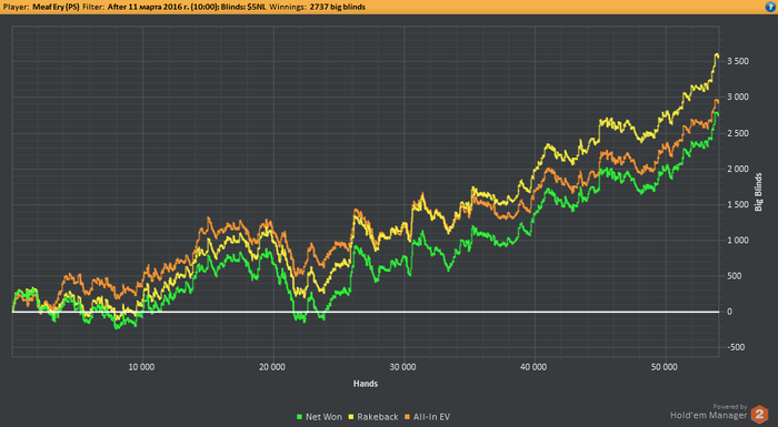 Я конечно, сегодня покатал, часок на нл10.. +7,5$, 6 столиков. Потом пошел пробивать ренджа с нл5 за 338к рук, там я и увидел.. что нихуя не изменилось. Охуел только с того, что расширился везде по максимуму и все ситуации плюсовые. А винрейт.. по факту 1 с копьем, по EV 2,44. Общее: +550$(250$ РБ + профит 300(по EV еще +100). Но за то у меня есть охуенные времена 11-21 марта.