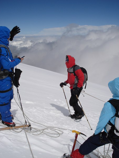 Нас ждал очередной подвох. Оказалось, что подниматься проще, чем спускаться. Гид потом сказал, что 80% людей погибают именно на спуске. Вверх идёшь на адреналине, а вниз сил уже нет. И реально идти сложнее: в кошки снег забивается, тяжело держать сцепление. Идём в связке, а я постоянно, буквально после каждого шага, валюсь с ног.