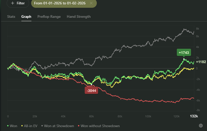 Решил в январе в тестовом режиме плотно погриндить покеркинг на рейкбек, и воможно их годовой статус набить, если всё пойдёт удачно. + Ещё перешёл на вечерне-ночной режим катки. В начале месяца дней 10 выпало за постновогодней суетой. Отыграл 110к рук, 950/час в среднем в -1,5евбб/100. Из-за лютых лагов х2н, адаптации режима дня, и пары сессий, где я неправильно рассчитал количество столов, думаю потерял привычно ожидания и денег. В какой-то момент был близок к закрытию эксперимента, потому что шёл в -4,5бб/100 на приличную дистанцию + проблемы с софтом сильно действовали на нервы. Пока что думаю продолжать, и надеюсь, что где-то 200к раздач в месяц при винрейте от 0 до -1бб получится выдавать.